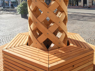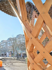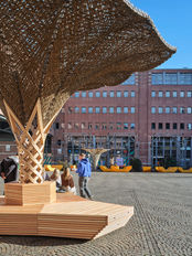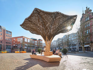 Der schattenspendende komorebi kombiniert eine zweistufige Sitzgelegenheit mit einem lichtfilternden Flachsfaserdach. Dank der FORMIC-Transporteinheiten des auf Schwerlasttransportsysteme spezialisierten Startup FORMIC Transportsysteme GmbH des KIT kann er flexibel auf dem Platz bewegt werden und bietet dadurch unbegrenzte Möglichkeiten, den Kronenplatz zu gestalten. Die Jungfernfahrt erfolgte im Dezember 2024.
