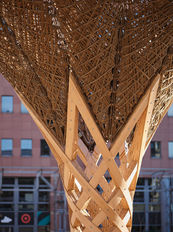 Ein besonderes Augenmerk liegt bei der Gestaltung des komorebi auf der Materialentwicklung und der Anwendung digitaler Technologien für zirkuläres und nachhaltiges Bauen. Durch den gezielten Einsatz von Planungstools und digitalen Fertigungssystemen über den gesamten Entwicklungsprozess hinweg können ressourcenschonende und zugleich ästhetisch anspruchsvolle Strukturen realisiert werden, die durch spezifische Konfigurationen an die Bedürfnisse der Nutzerinnen und Nutzer angepasst werden können.